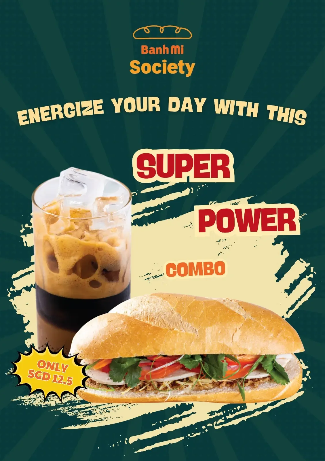 Taste the Street Food Icons! Exclusive Super Power Combo! Craving a delicious, energy-packed meal? Our in-store exclusive SUPER POWER COMBO brings you the best of Vietnamese street food: a mouth-watering Traditional Banh Mi and a refreshing Vietnamese Milk Iced Coffee. Loved by all and bursting with flavor, get this powerful duo for an incredible ONLY SGD 12.5! Fuel up the authentic way.