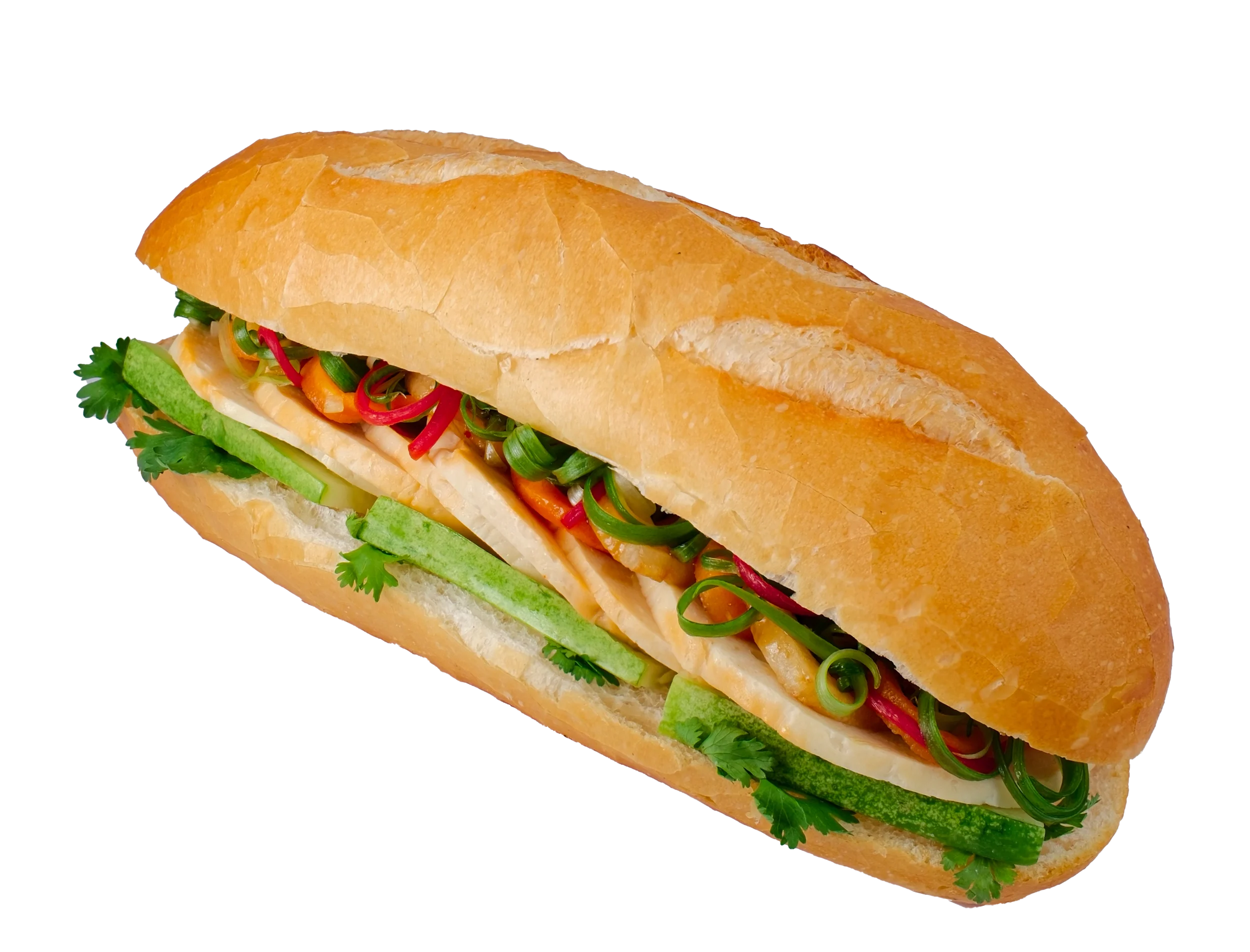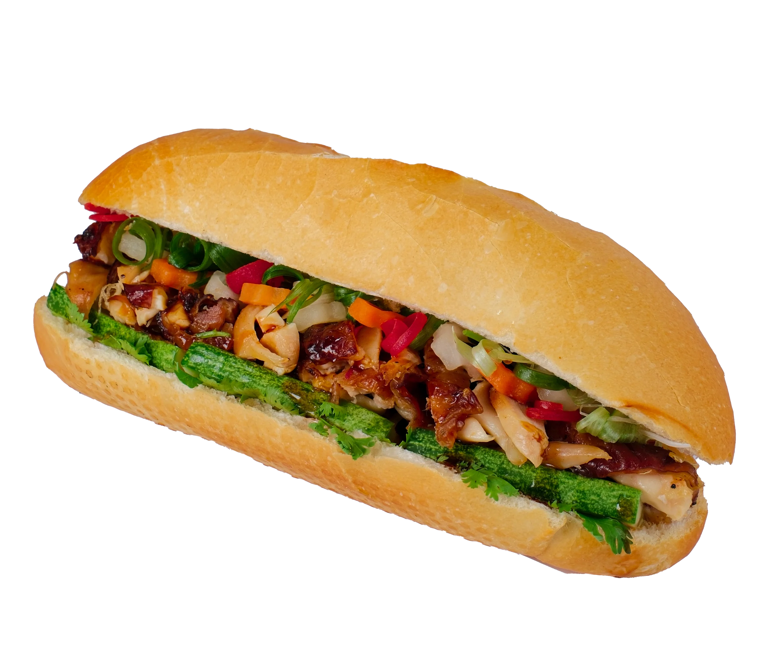 Each Banh Mi is generously packed with an abundance of fresh, crisp ingredients, ensuring a delightful crunch and vibrant taste in every bite. Enjoy the cooling freshness of cucumber, the aromatic lift of coriander, the subtle bite of spring onions, and the tangy sweetness of pickled vegetables. All these elements come together within a perfectly toasted, airy baguette, delivering a textural and flavor experience that is both satisfying and unforgettable. Our Traditional Banh Mi is a culinary journey to the streets of Vietnam, crafted with care and tradition.